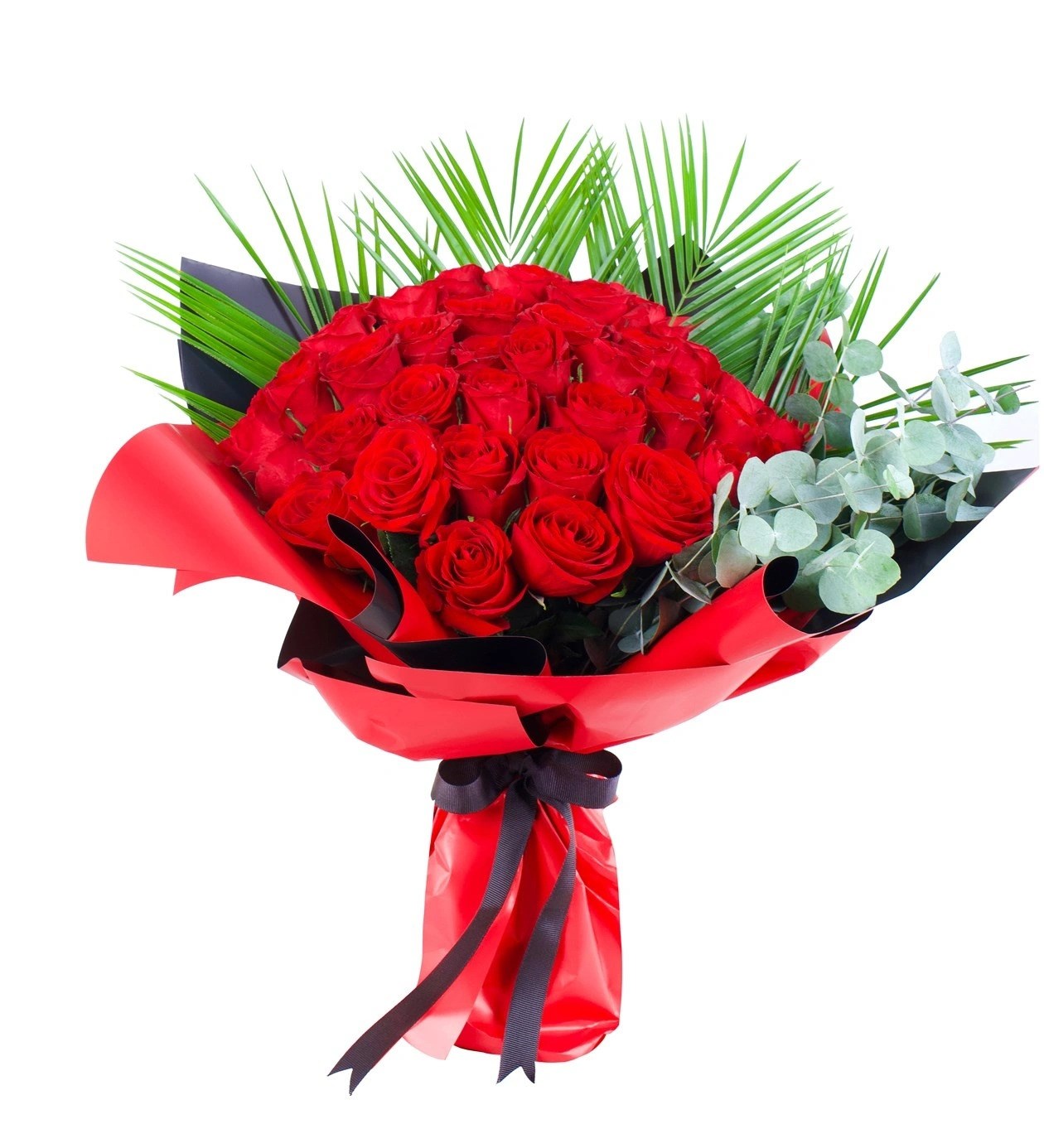Aşkın ve tutkunun en güçlü ifadesi olan 30 adet kırmızı gül, okaliptus ve gipso çiçekleriyle zenginleştirilerek modern ve şık bir buket haline getirildi. Kırmızı ve siyah çift renkli buket kâğıdı, tasarıma güçlü ve premium bir duruş kazandırırken, özel anlar için etkileyici bir hediye alternatifi sunar.