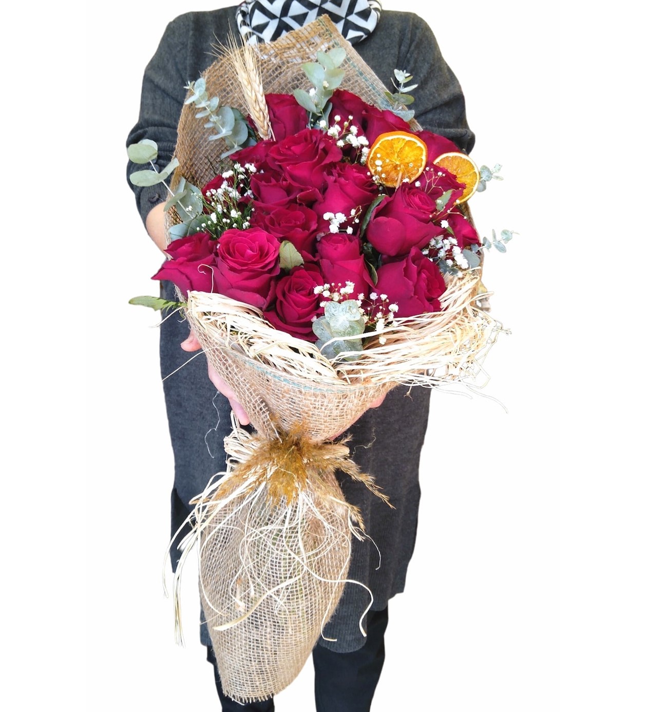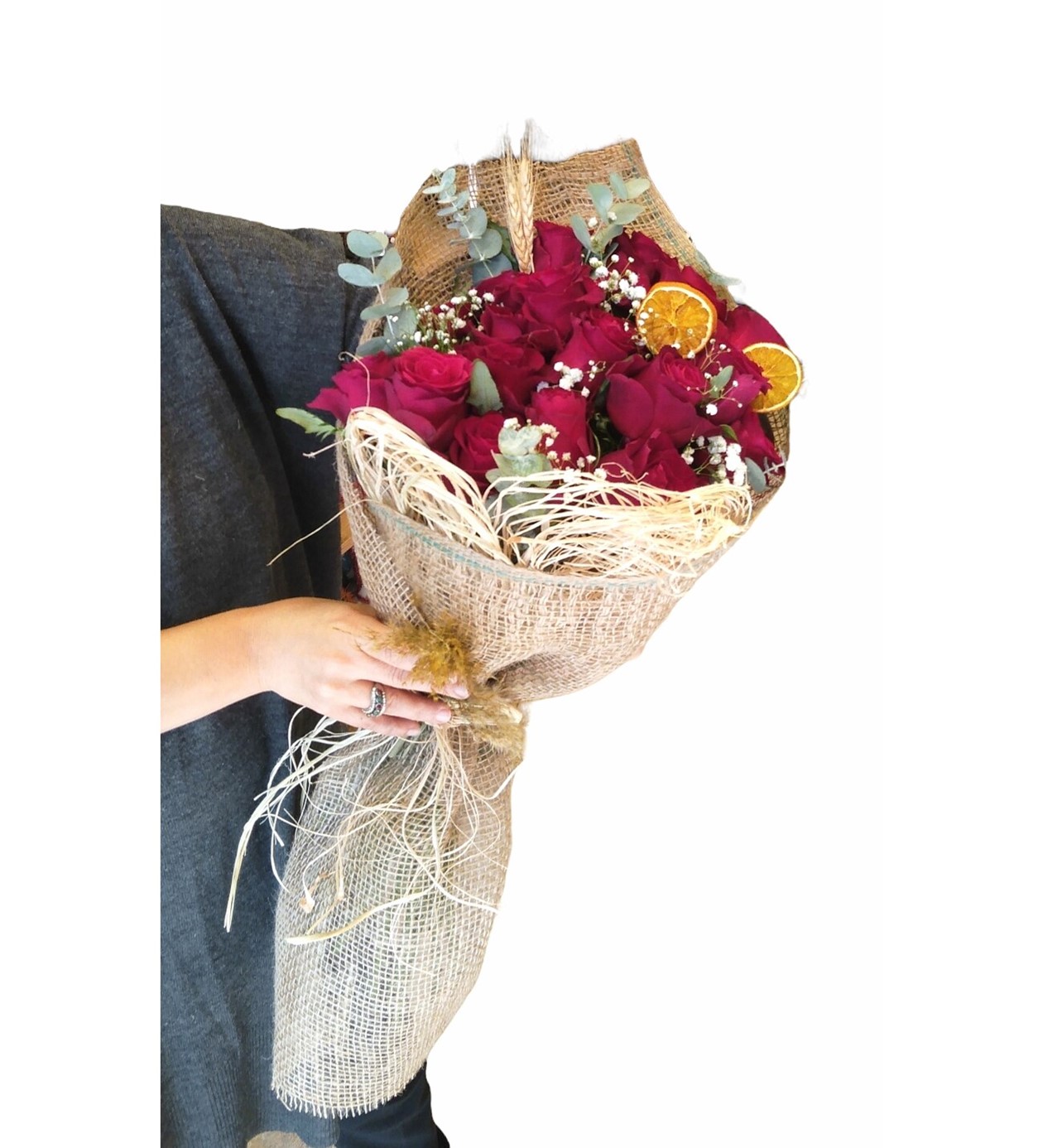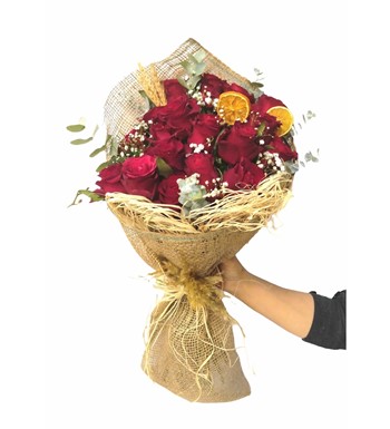 Ürün içeriği :19 adet rodos kırmızı gül, 3 adet buğday başak, Dokuma çuval buket, Rafya, okaliptus, Gipso.