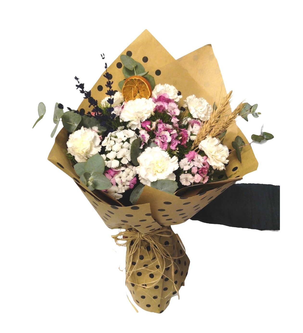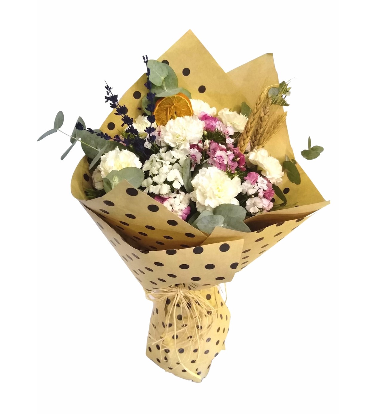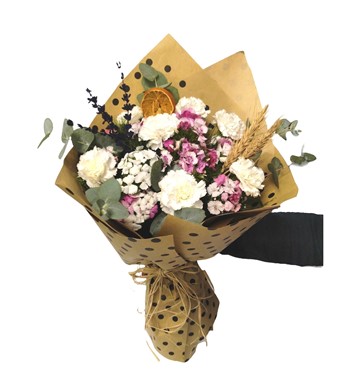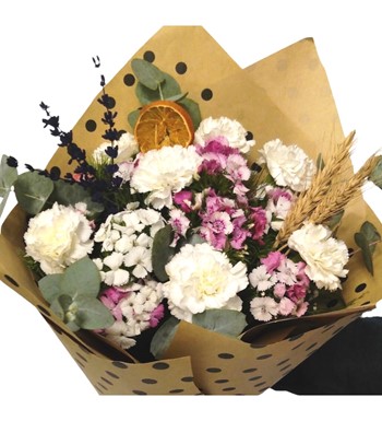Pauntiyeli buket kağıdında For ever puantiye serisi beyaz karanfil, hüsnüyusuf ve kuru çiçekler eşliğinde süslemiş olduğumuz aranjman buketimiz sevdiklerinizi mutlu edebilebilecek en güzel hediyelerden biri neden olmasın.