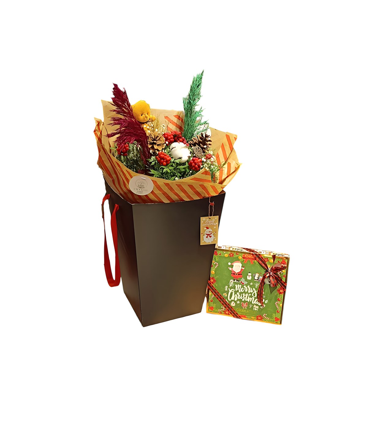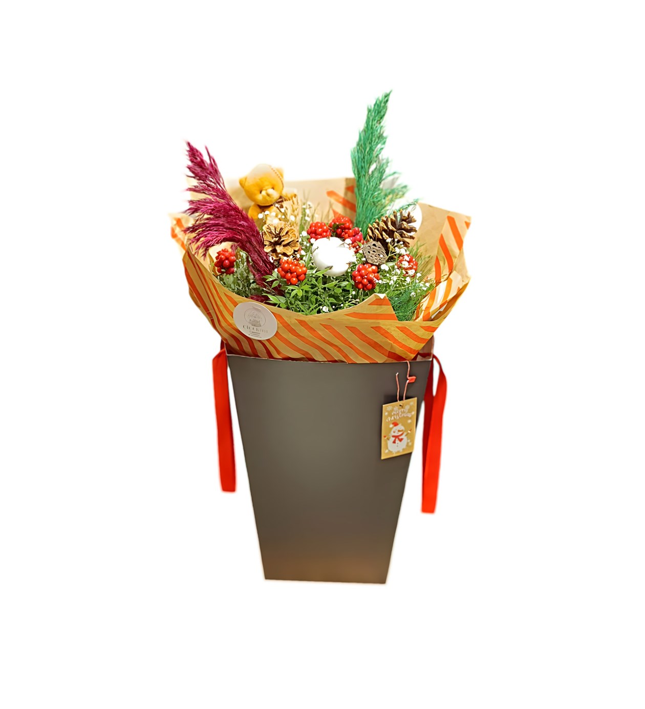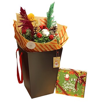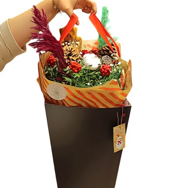 Yeni yılın vazgeçilmez çiçeği kokina, zarif bir dokunuşla siyahın şıklığına bürünüyor. Çizgili buket kağıdıyla özenle hazırlanan bu eşsiz tasarım, siyah kutu taşıma içerisinde sunularak hem modern hem de şık bir görünüm sağlıyor. Kokina, yeni yıl için sevgi, umut ve mutluluk dolu bir hediye seçeneği olarak öne çıkıyor.