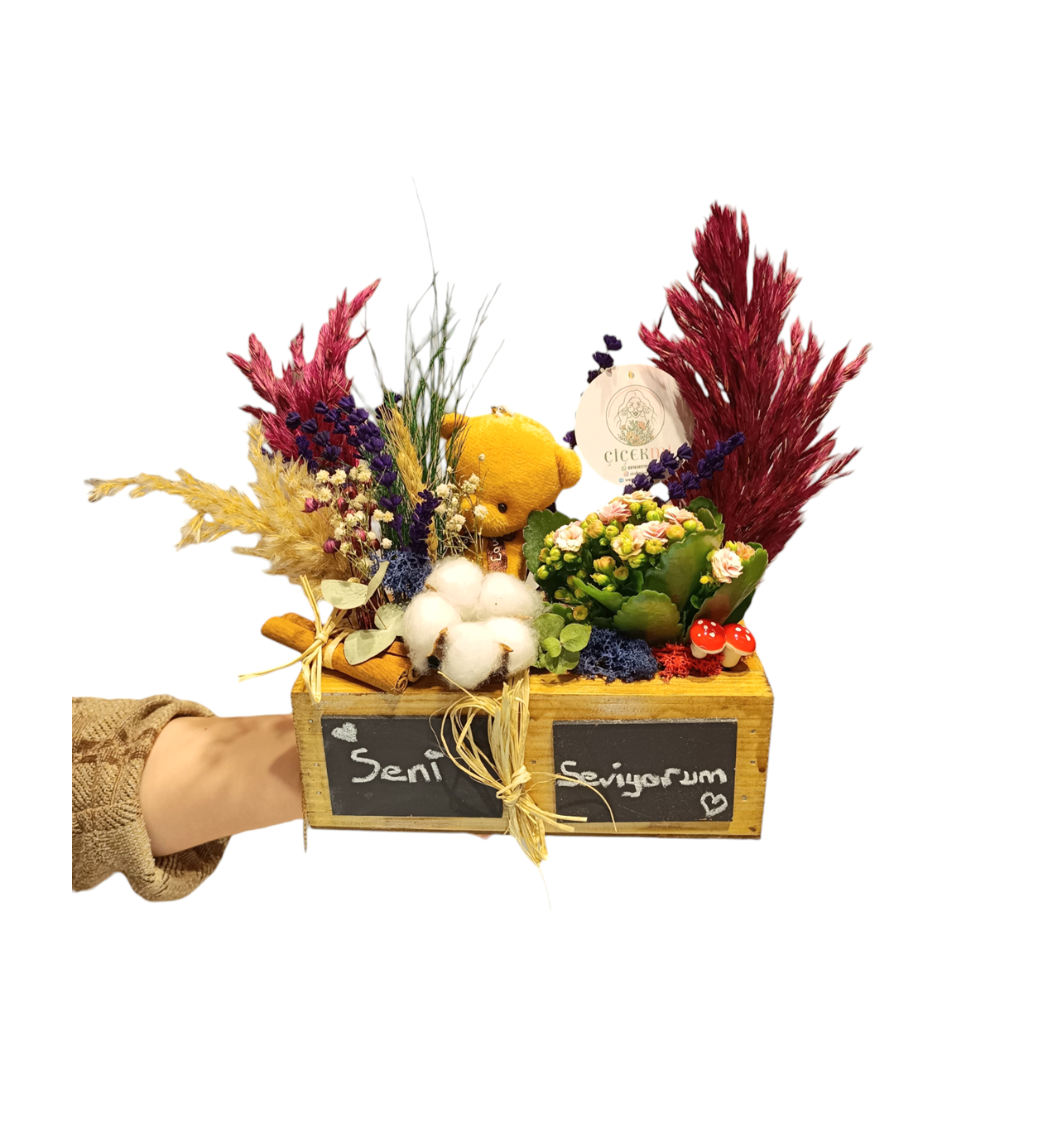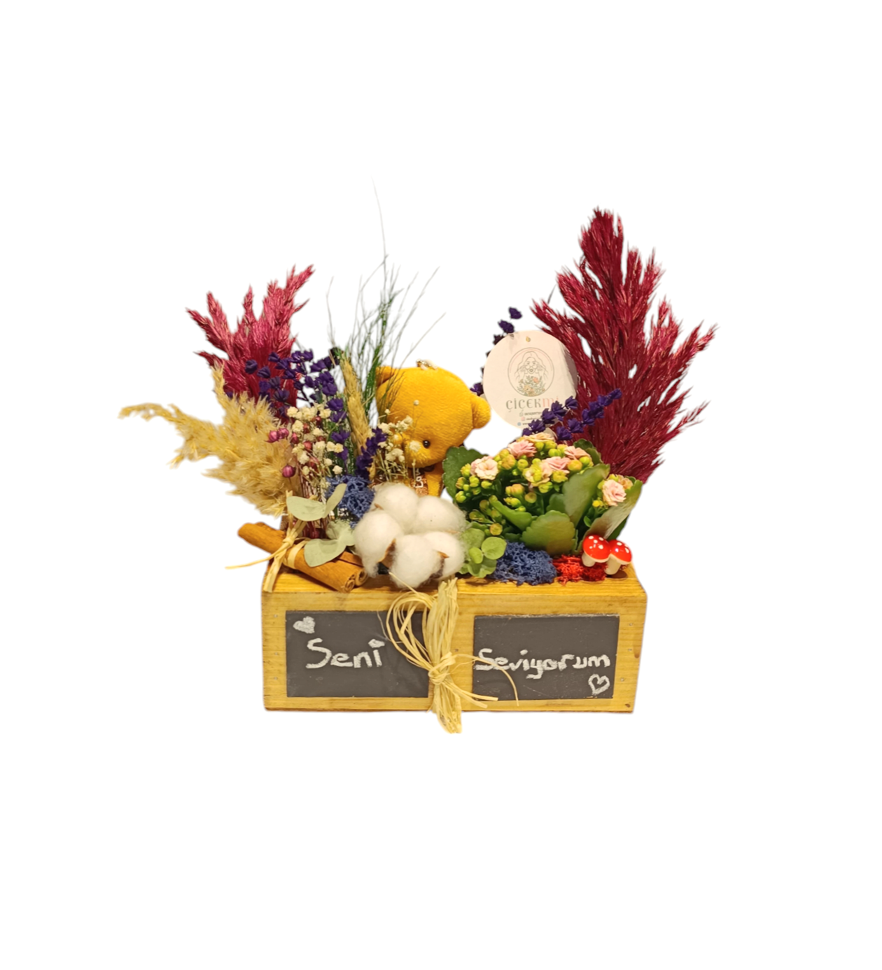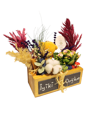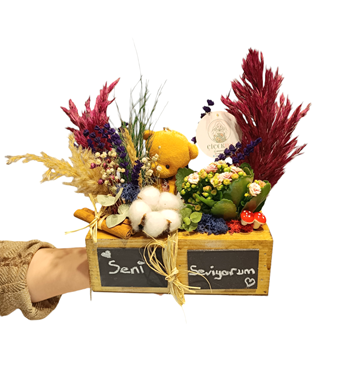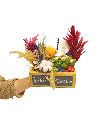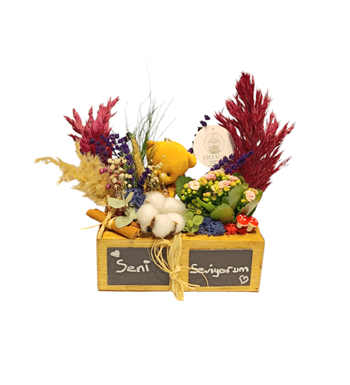 Ahşap kutumuz, 20x10 cm boyutuyla zarif ve kompakt bir hediye seçeneği sunar. İlk gözünde özenle seçilmiş kuru çiçekler ve sevimli bir ayıcık bulunurken, ikinci gözünde bakımı kolay ve dayanıklı Kalanchoe çiçeği yer alır.Tebeşir ile yazı alanı ise maximun bir taraf 7 Karakter diğer tarafıda 7 karakter olmak üzere Maximun 14 karakter Yazılabilmektedir. Ayrıca 1 adet tebeşir gönderilmektedir. Kolay silinip yazılabilmektedir. Kuru çiçeklerin büyüleyici görüntüsüyle tamamlanan bu tasarım, bulunduğu ortama zarafet katarken, Kalanchoe çiçeğiyle doğayı evlere taşır.