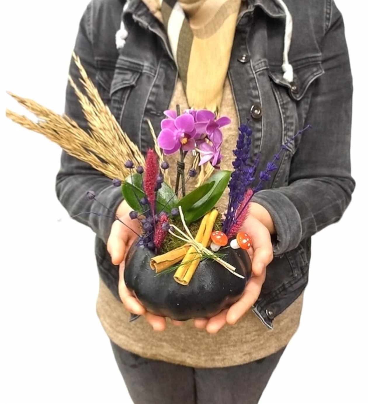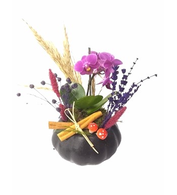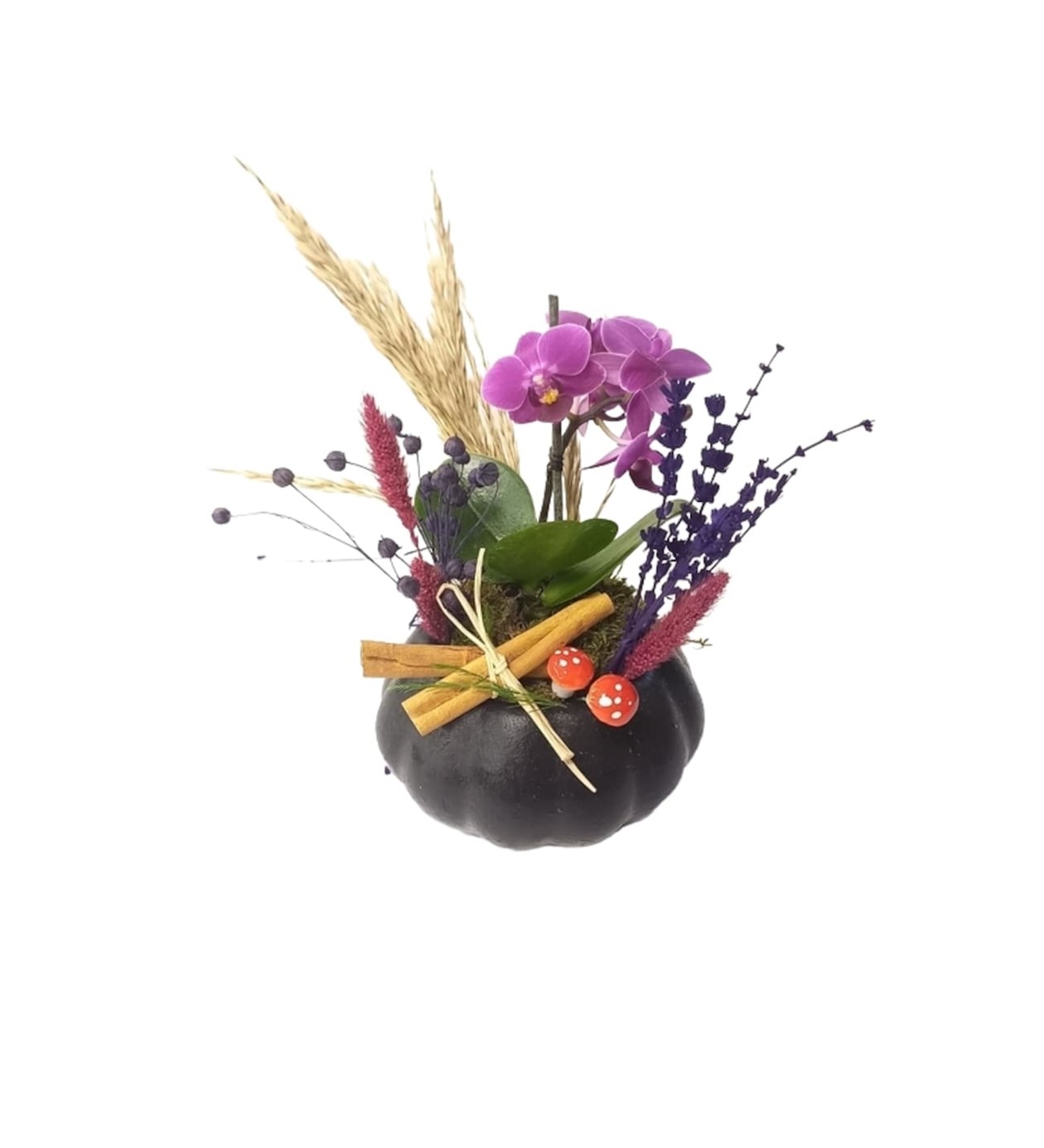 Ürün İçeriği: Siyah kabak saksı, Mini Mor Orkide, Pantpas otu, Lavanta, Setteria mor, luna, mantar, tarçın.