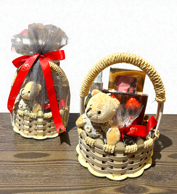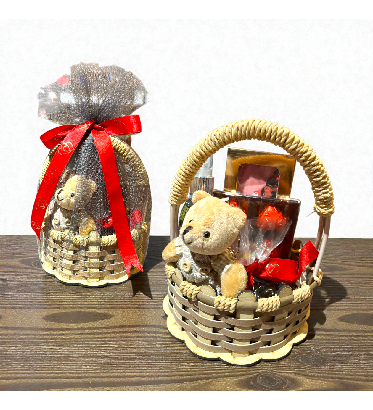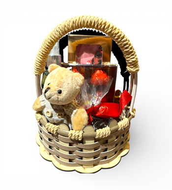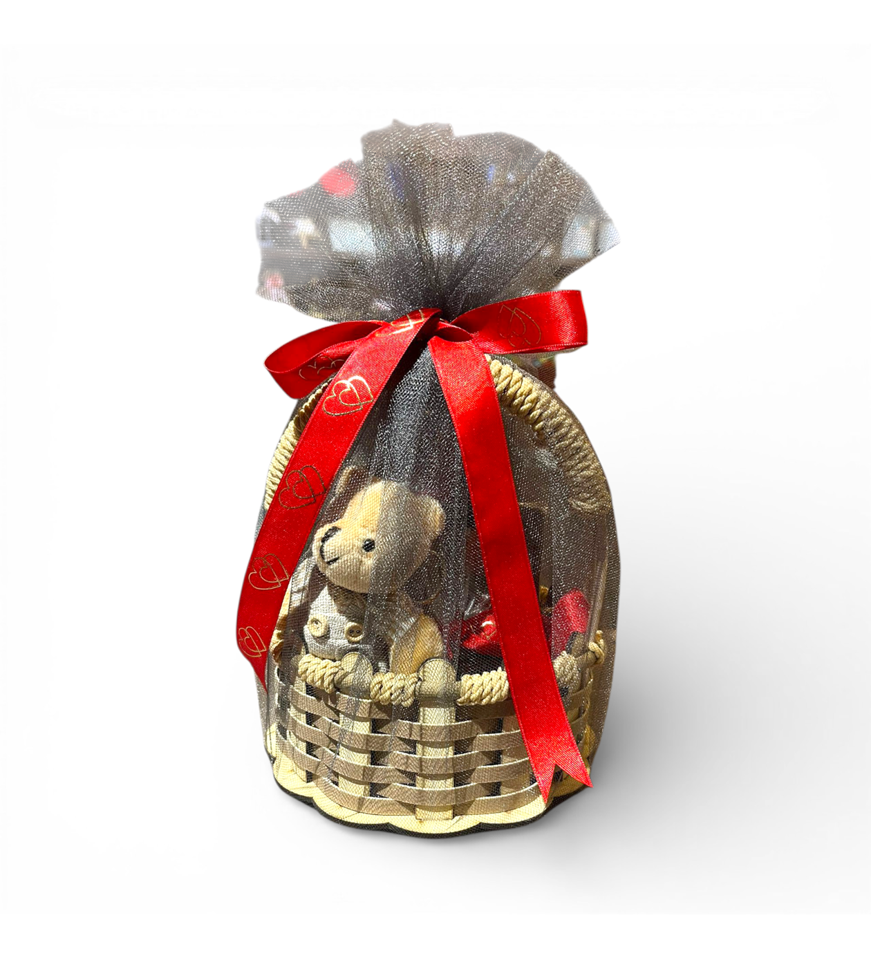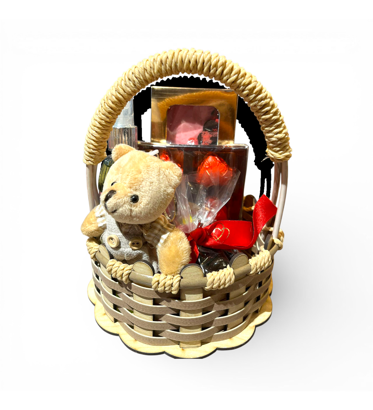 Sepet içeriğinde yer alan portakallı tablet çikolata ve portakal draje, ferah aromasıyla keyifli bir tatlı deneyimi sunarken; kolonya hediyeye zarif ve klasik bir dokunuş katar. Anahtarlıklı küçük ayıcık, bu özel hediyeyi uzun süre hatırlanacak sevimli bir anıya dönüştürür. Sargılı mini kalp ise hediyeye romantik ve duygusal bir anlam kazandırır.